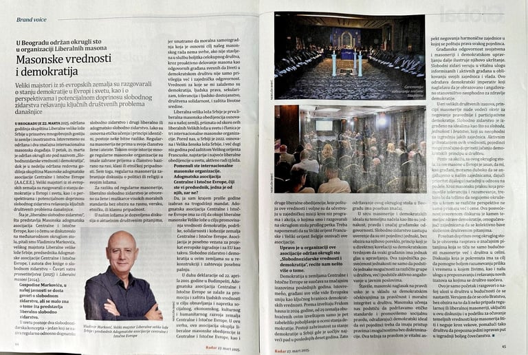 U broju od 27. Marta 2025 godine Beogradski nedeljnik RADAR je objavio intervju sa Velikim Majstorom Liberalne Velike Lože Srbije Vladimirom Markovićem, povodom Internacionalne Masonske Konferencije održane u Beogradu 21. Marta u prisustvu Velikih Majstora iz 16 Evropskih zemalja.