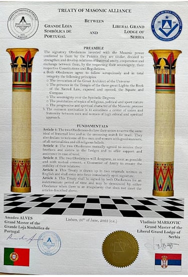 Dana 26. juna 2022. godine u Or. Lisabon, tokom godišnje skupštine Simboličke Velike Lože Portugala, potpisan je Ugovor o masonskom savezu između Simboličke Velike Lože Portugala i Liberalne Velike Lože Srbije.U ime SVLP-a Ugovor je potpisao Veliki Majstor N:.U:. Brat Amadeu Alves, a za Liberalnu Veliku Ložu Srbije potpisnik je bio Veliki Majstor N:.U:. brat Vladimir Marković.